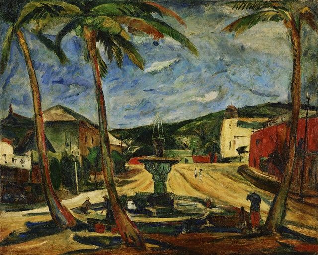 廖繼春1931年《有椰子樹的風景》,是繼1928年《有香蕉樹的院子》入選帝展後,再度入選的畫作。這幅《有椰子樹的風景》,取材高雄火車站前的景色。他站在車站前面的觀看位置,從噴水池望向前面寬敞的道路、兩旁現代建築物、遠山以及寬闊的天空。畫面近景三株椰子樹包圍著噴水池,帶斗笠的小販坐在池邊休息交談,另一旁撐傘的親子經過。從地面上的陰影、椰子樹葉隨風搖曳、天空流動的雲彩表現,顯示這是艷陽高照、暖風吹來的好天氣,是台灣南部常見的氣候景觀。如果我們對照高雄車站的老照片,會發現廖繼春特意拉高椰子樹的比例,作為畫面的表現重心,呈現熱帶的南台灣意象。(節錄:黃琪惠/2015典藏展語音導覽)
