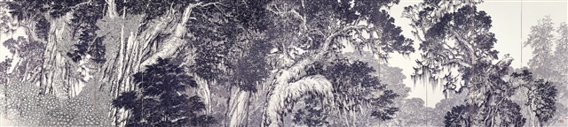巨型水墨畫《木靈》由十二曲屏風組成,是鄉原古統於1934年第八回台展東洋畫部展出的作品。身為台展審查員的鄉原古統,在1930至1935年間提出一系列台灣大自然景觀畫作,包括連峰迭起的能高山脈、驚濤拍岸的北關怒潮、水流湍急的太魯閣峽谷,以及參天的阿里山神木。木靈是日本傳說中寄宿在樹木裏的精靈,鄉原古統藉此表現台灣千年神木的不可思議力量。他以迫近式構圖描繪森林檜木的蒼勁蓊鬱,運用各種濃淡細緻的筆墨,表現樹幹的構造紋理、樹葉與氣根,又好像與山壁融為一體。右方岩壁有一獼猴佇立觀望,猶如守護神保衛著台灣的高山森林。(節錄:黃琪惠/2015典藏展語音導覽)