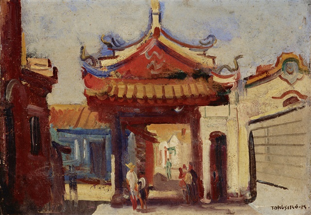本館所典藏的《安平風景》一作,依作品背板所記載,創作於昭和11(1936)年3月,可能是小早川應聘至臺南作畫之時,考察當地歷史古蹟所繪製的風物畫。滄海變桑田、荒灘崛新城,畫中景物為何處已不可考,惟中國風建築,極具安平風俗特色,作者以粗獷飛快筆線勾勒出屋舍的外形,洋溢傳統建築物的古樸與歷史意義。右下方的黑字署名不但調和線條的勾勒,也平衡左右色彩的濃淡。(節錄:林皎碧/典藏目錄2011)