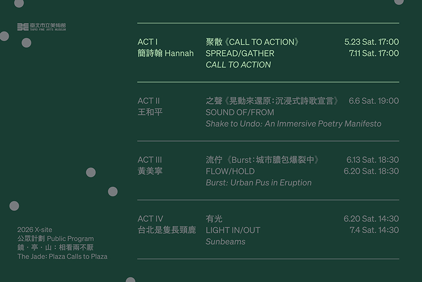 2026 X-site《鏡・亭・山:相看兩不厭》公眾活動,從一道裂縫展開。循著這道開口,向內深入,也向外開展,邀請觀眾走進/出作品、廣場與美術館之間的空間,透過身體與感知,重新經驗光影、聲音、尺度與觀看之間的關係。活動回應作品中的「鏡」、「亭」、「山」三個元素,透過反射與折返、停留與聚集、抬升與回望,發展出一系列不同形式的現地實踐。