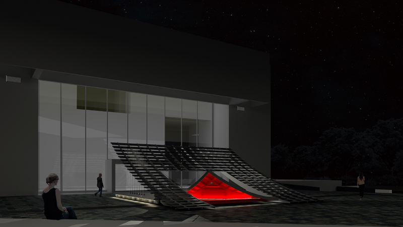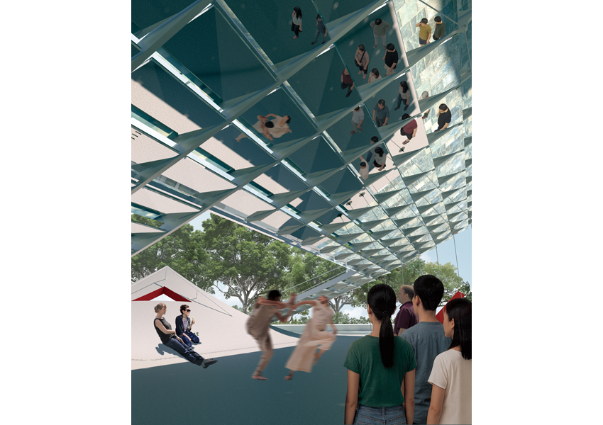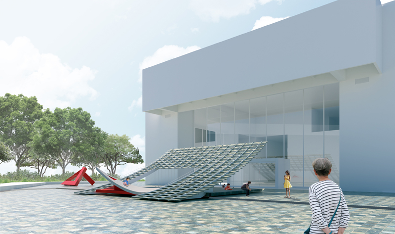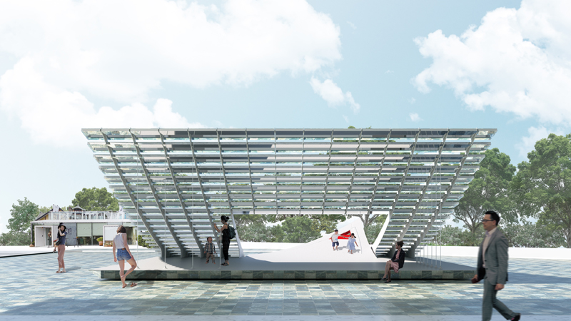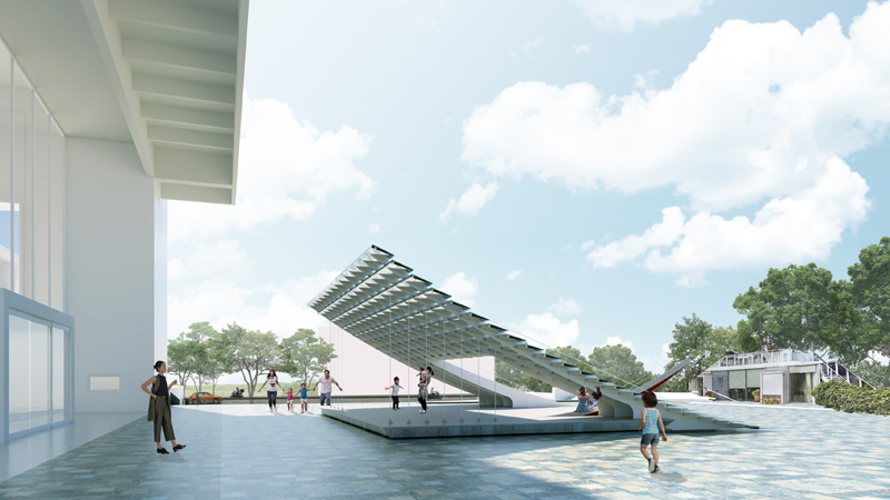 《鏡‧亭‧山》回應室外廣場的環境條件,將地面輕輕掀起,創造具遮蔭且通透的空間,讓人們願意停留,「空白的、缺席的」廣場重獲公共性。